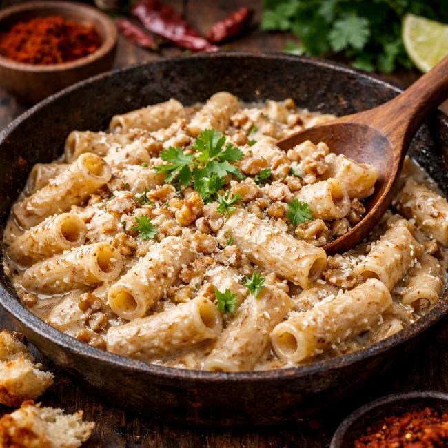 Los macarrones con salsa cremosa de nueces son un plato reconfortante, elegante y lleno de matices. La pasta, perfectamente cocida al dente, se envuelve en una salsa suave y aterciopelada elaborada con nueces finamente trituradas, que aportan un sabor intenso, ligeramente tostado y delicadamente dulce.